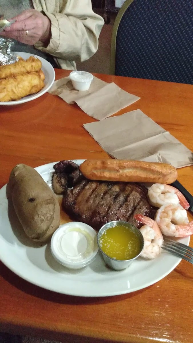 Thursday 2-4-1 Ribeye Night with Grilled Shrimp Added Cheesy Mashed Potatoes and a Breadstick